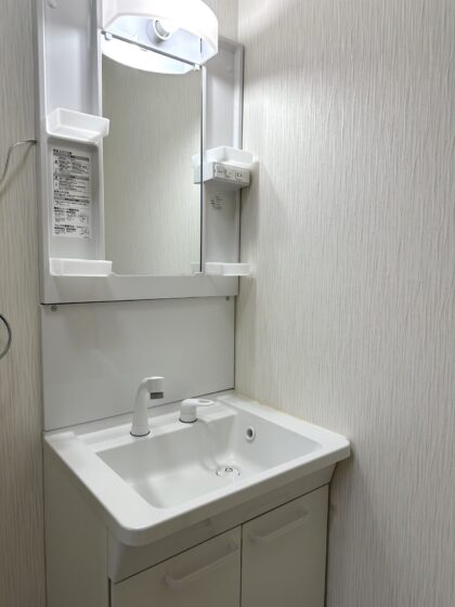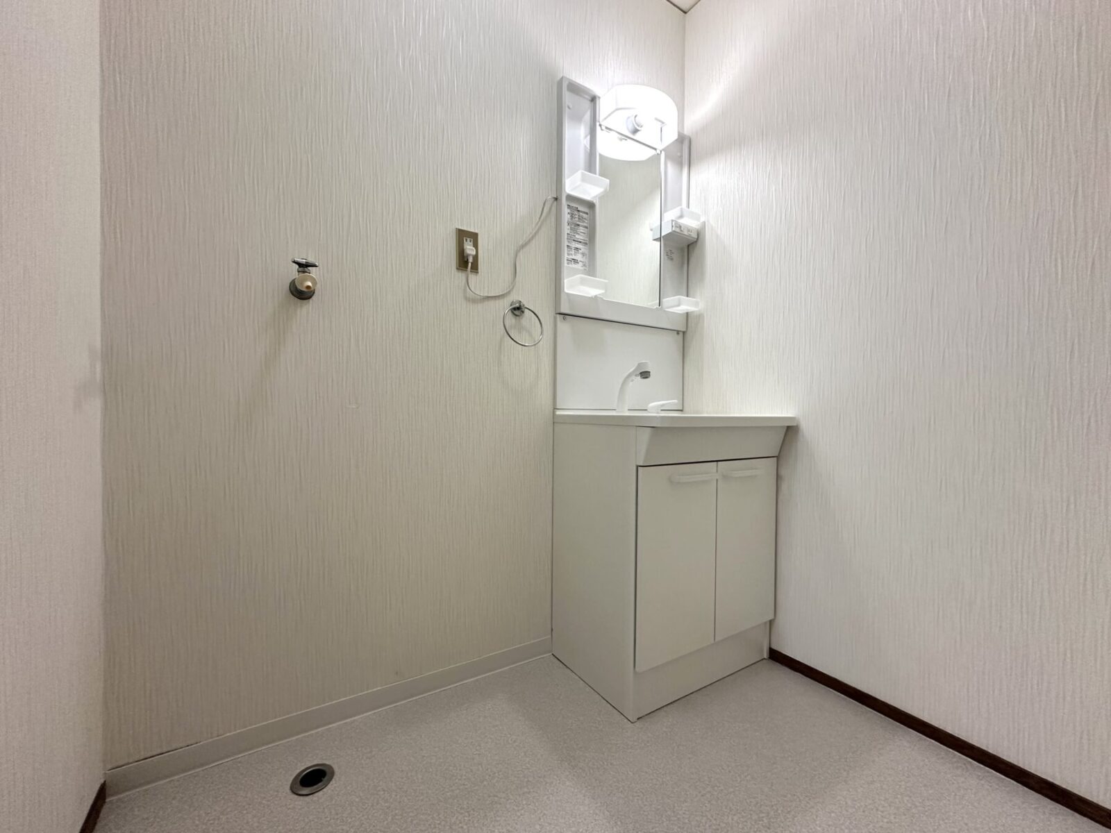 洗面台は伸縮タイプのシャワー水栓のため洗面台にて洗髪ができたり、お掃除も簡単です。