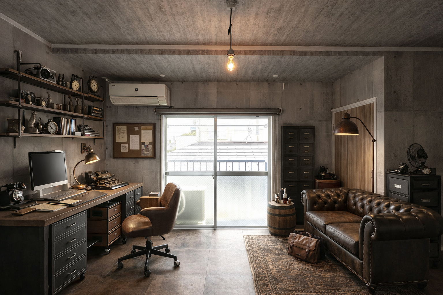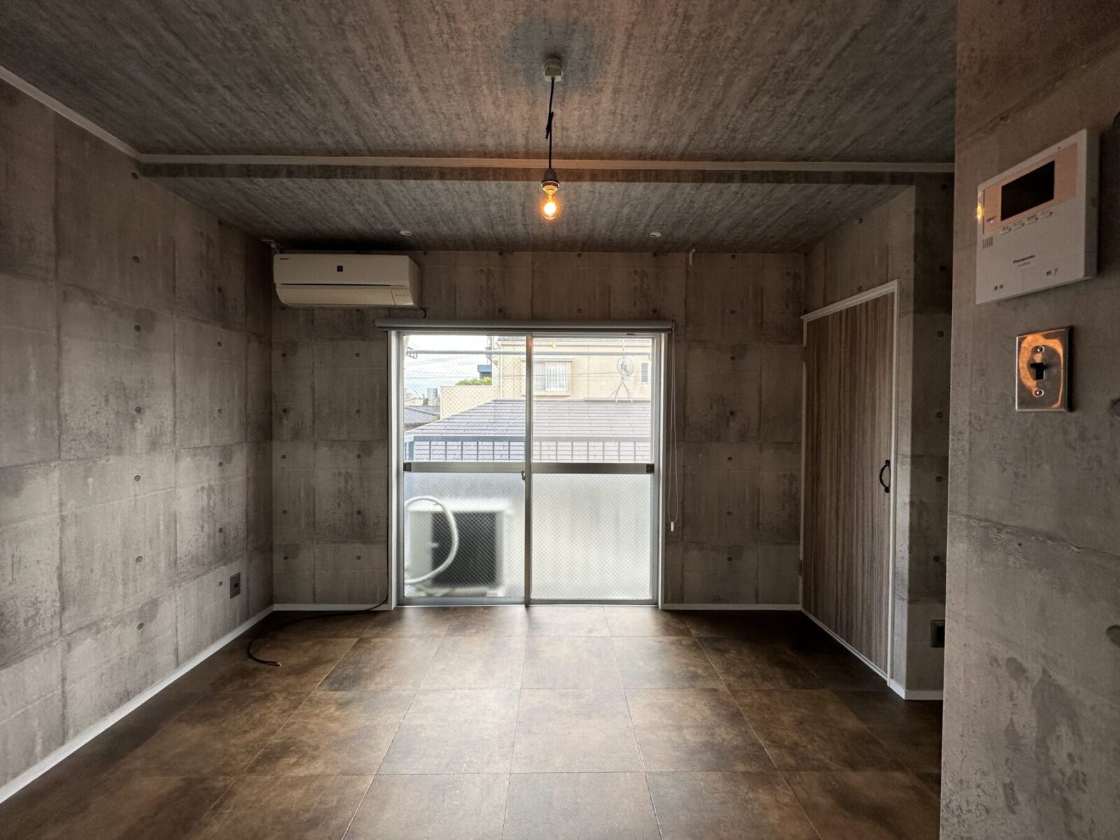 室内はコンクリート打ちっぱなし柄,、床はヴィンテージタイル調でスタイリッシュな内装です。