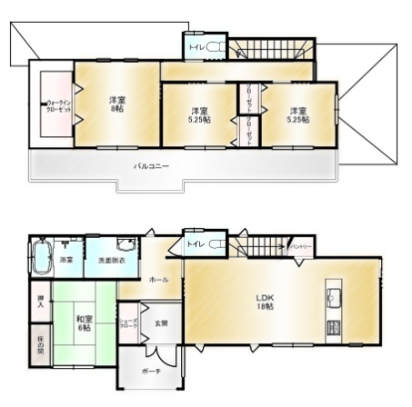 | 間取内容 | LDK18帖 1階 1室和室6帖 1階 1室洋室8帖 2階 1室洋室5.2帖 2階 2室 | ||