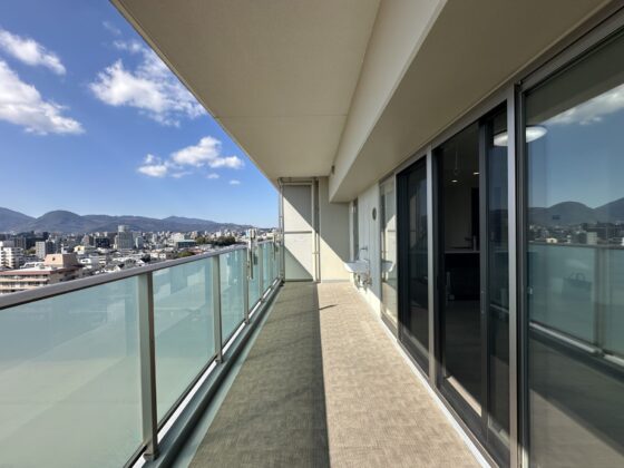 リビングは大きな窓で明るく心地よい空間です。10階ならではの眺望は見晴らしも良く熊本城も望めます。