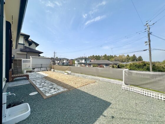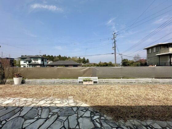 窓の外には広い庭があり。その先の隣地とは高低差がありますので圧迫感のない開放的な空間となっております。